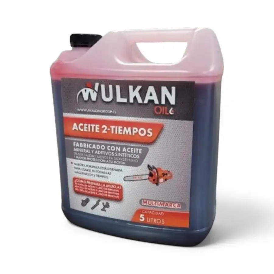 Aceite lubricante Wulkan de 5000 cc (5 Litros) para motores de 2 tiempos. Su formulación con aceite mineral y aditivos sintéticos garantiza una lubricación superior, protección contra el desgaste y una reducción significativa de la emisión de humo. Este formato de alto volumen es ideal para talleres y grandes faenas que requieren reabastecimiento constante de maquinaria 2T (generadores, motosierras). El producto se vende en formato de bulto de 4 unidades.