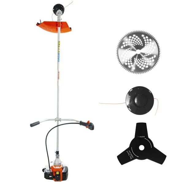 Desmalezadora máxima potencia 52 cc, incluye 3 accesorios: nylon, disco estrella y disco sierra. Para maleza densa y matorrales.
