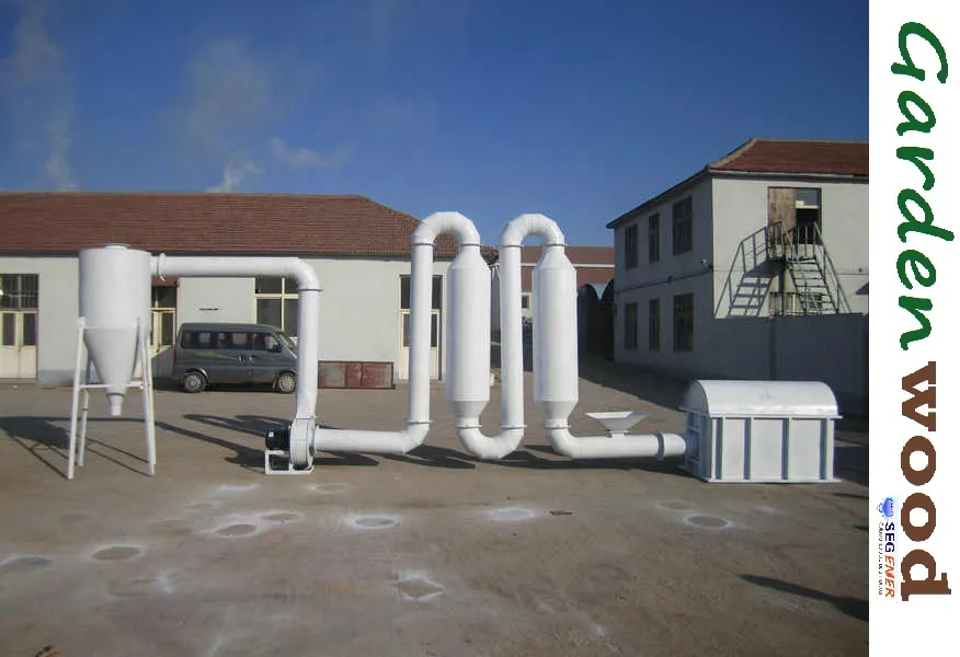 Secadora industrial de flujo de aire diseñada para la pre-acondicionamiento de aserrín antes de la peletización. Requiere conexión a una red Trifásica, impulsada por un motor de 4 kW. El sistema mezcla el material húmedo con aire caliente generado por una estufa de calefacción (suministrada por el cliente o parte del equipo según la configuración), y lo transporta rápidamente a través de tuberías. Esto permite la evaporación del agua. La capacidad de producción es de 350 a 450 kg por hora. El equipo está diseñado para reducir la humedad inicial del aserrín (que debe ser entre 25% a 30%) a una humedad final del 15% al 19%, ideal para biomasa. El tamaño del aserrín debe ser pequeño, entre 3 y 6 milímetros. Peso aproximado: 650 kg.